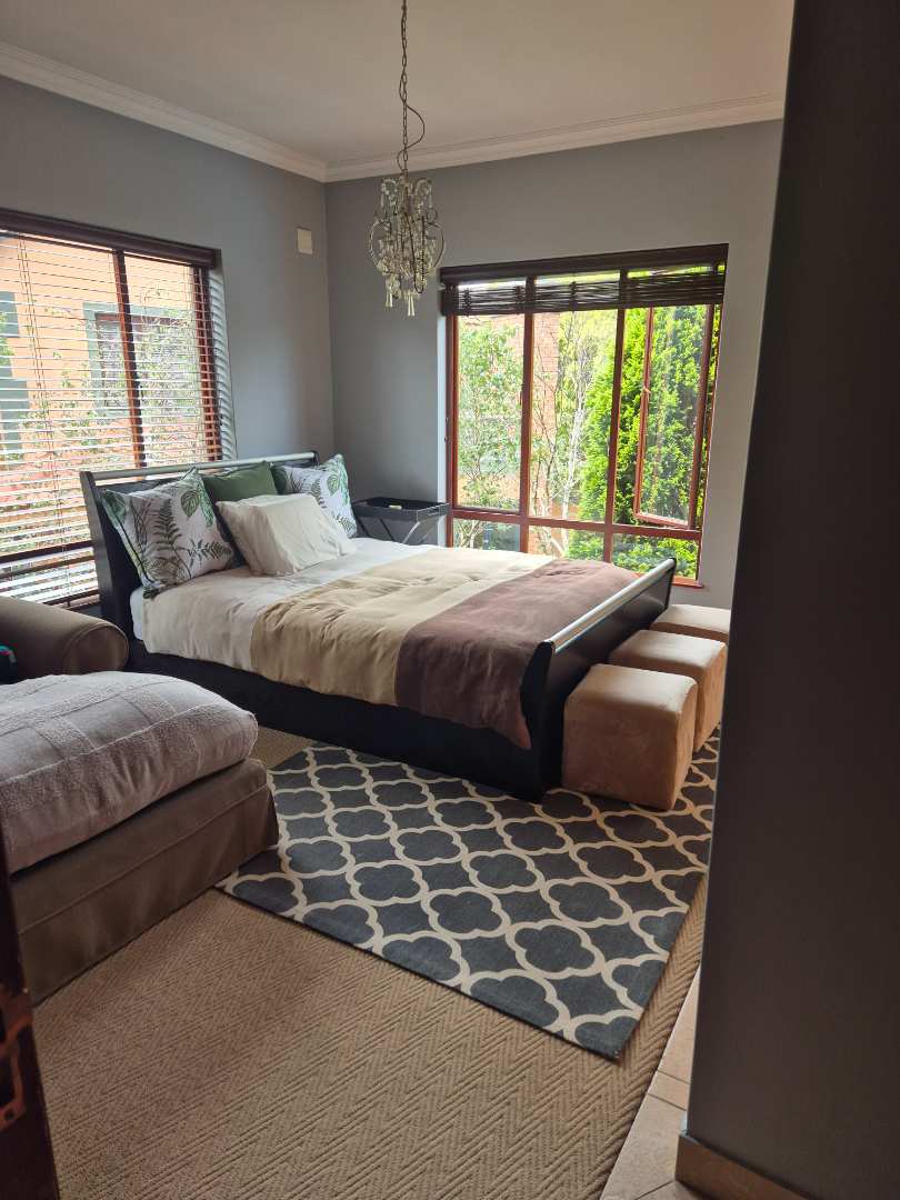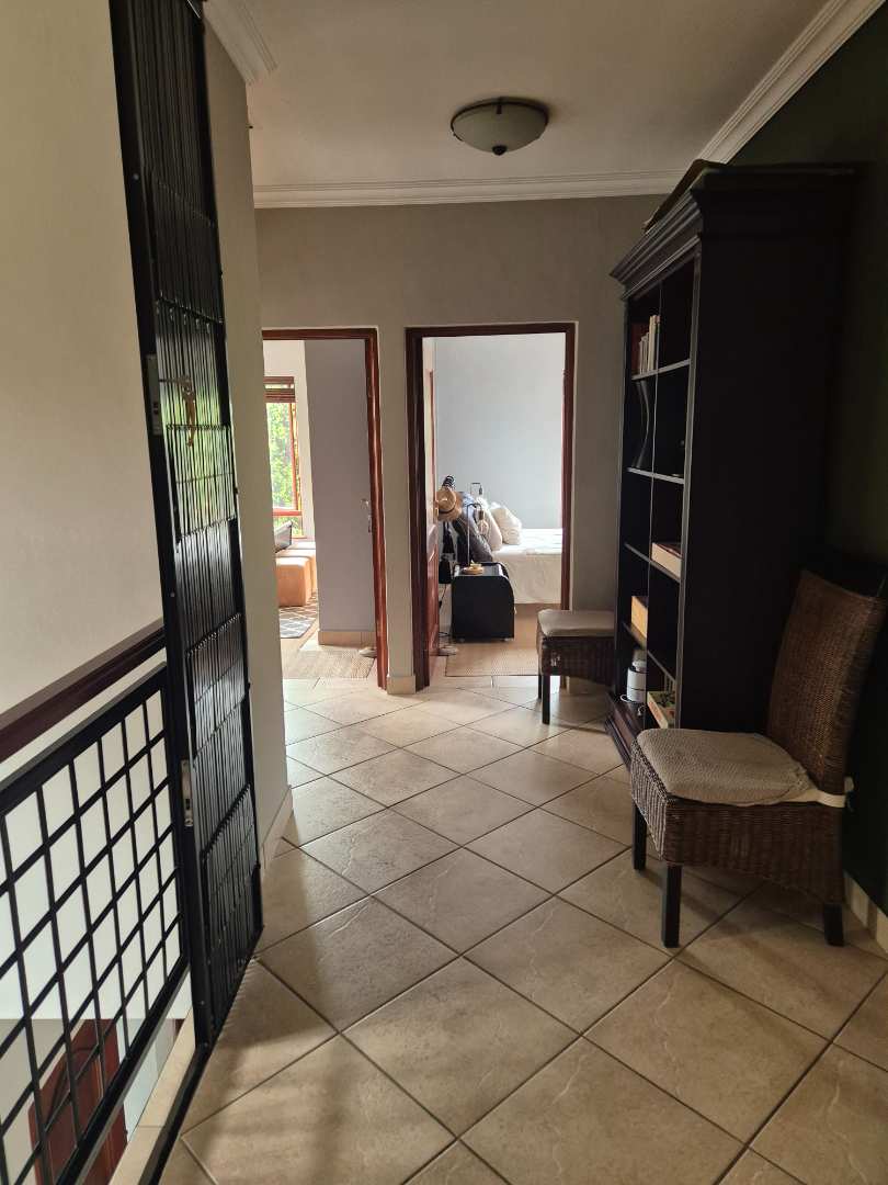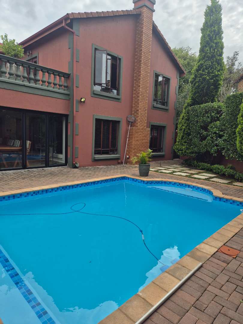 Downstairs is a formal lounge, TV lounge, dining room, enclosed parge patio with built-in braai and a jacuzzi. Stack doors which can be opened to enjoy the lovely garden and swimming pool.