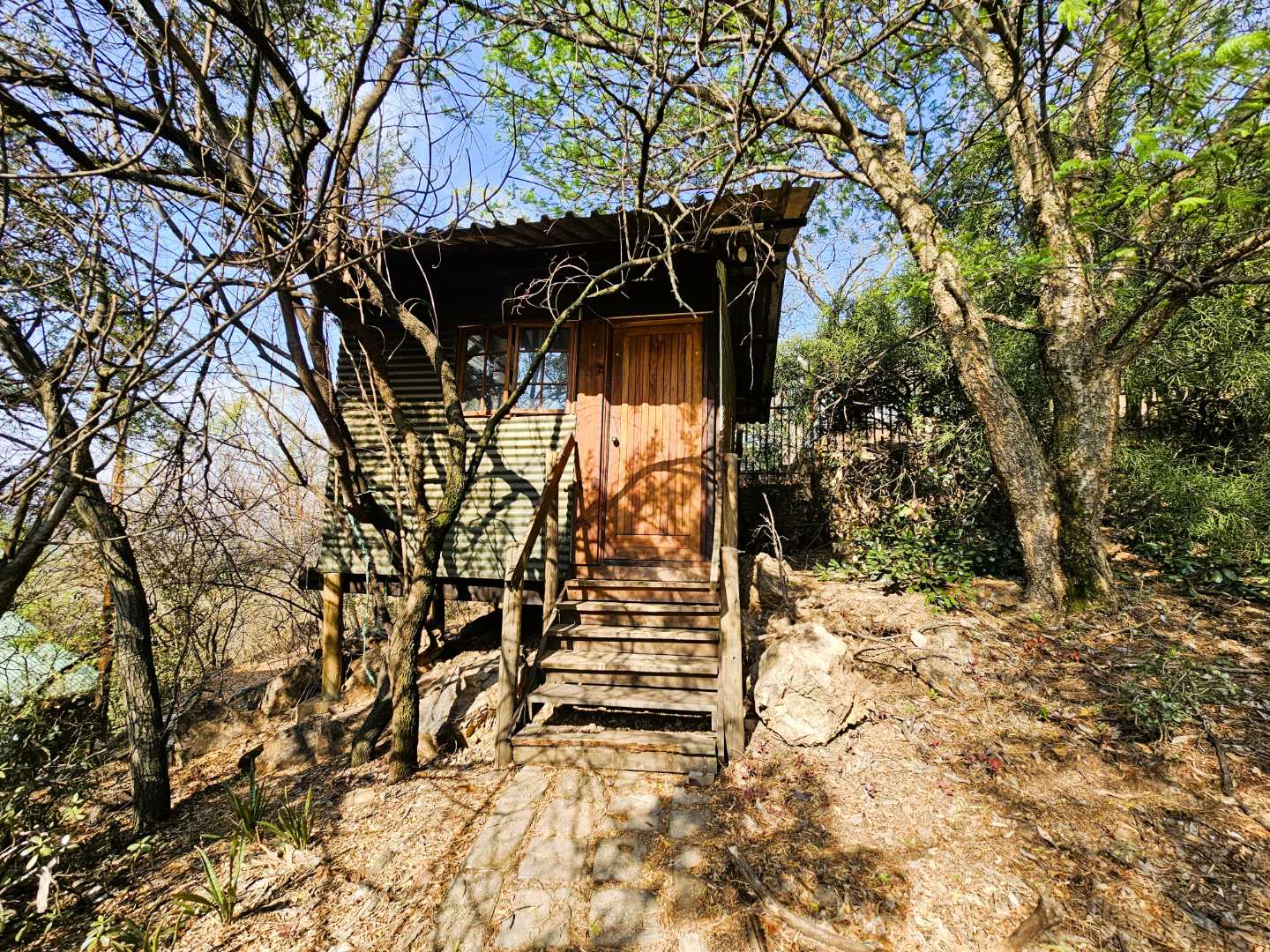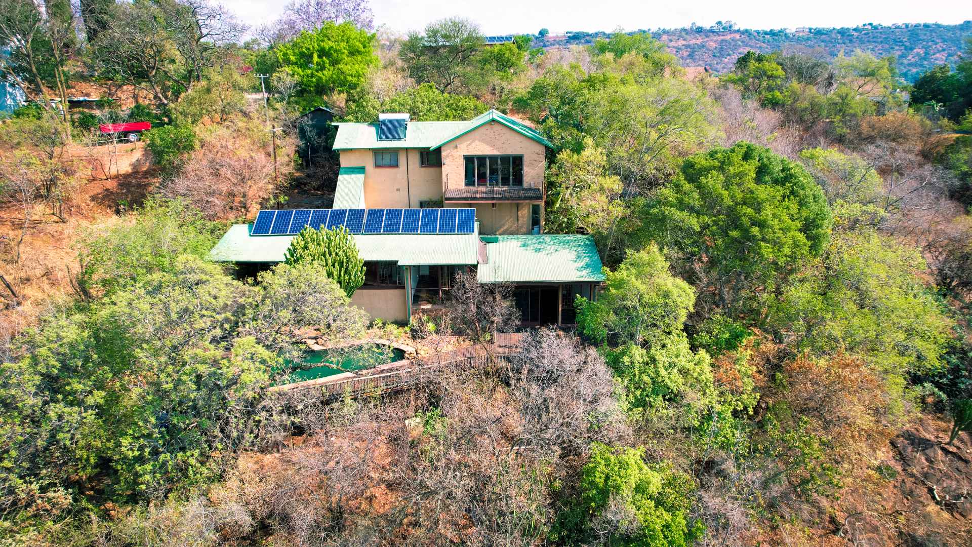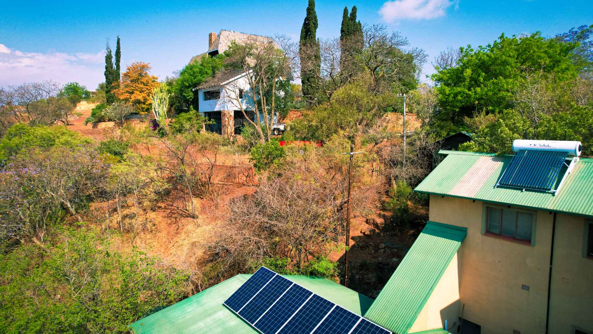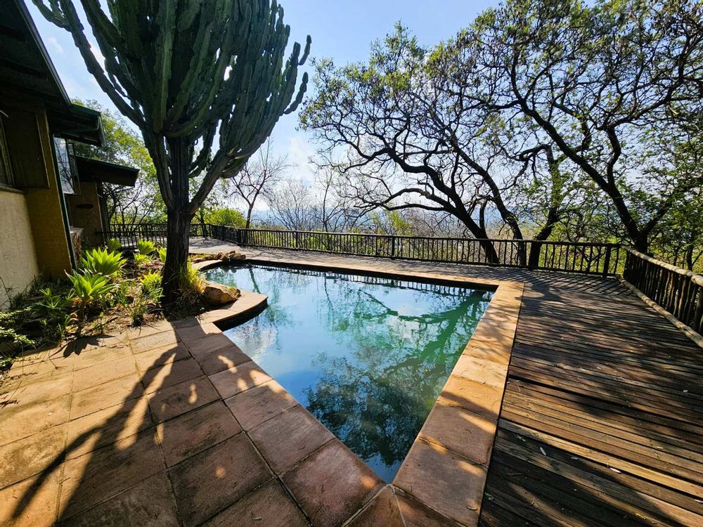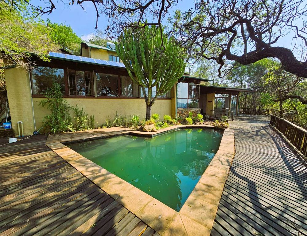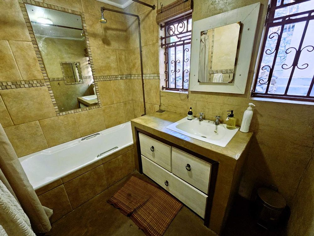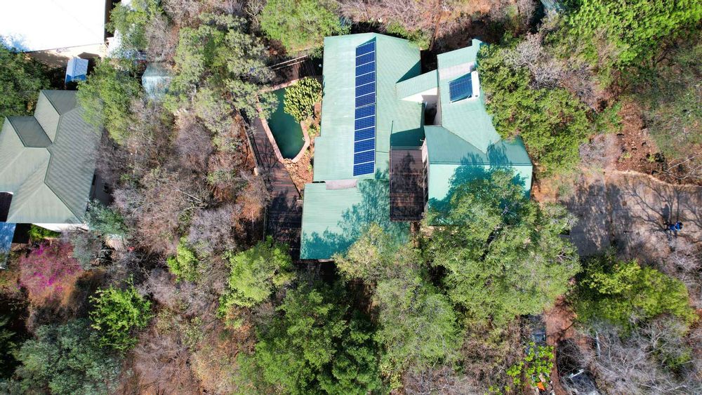 The property is equipped with solar panels, a battery system, and a water tank, ensuring no loadshedding interruptions. It also includes a bachelor flat and 3 cozy log homes, perfect for additional rental income or guests.