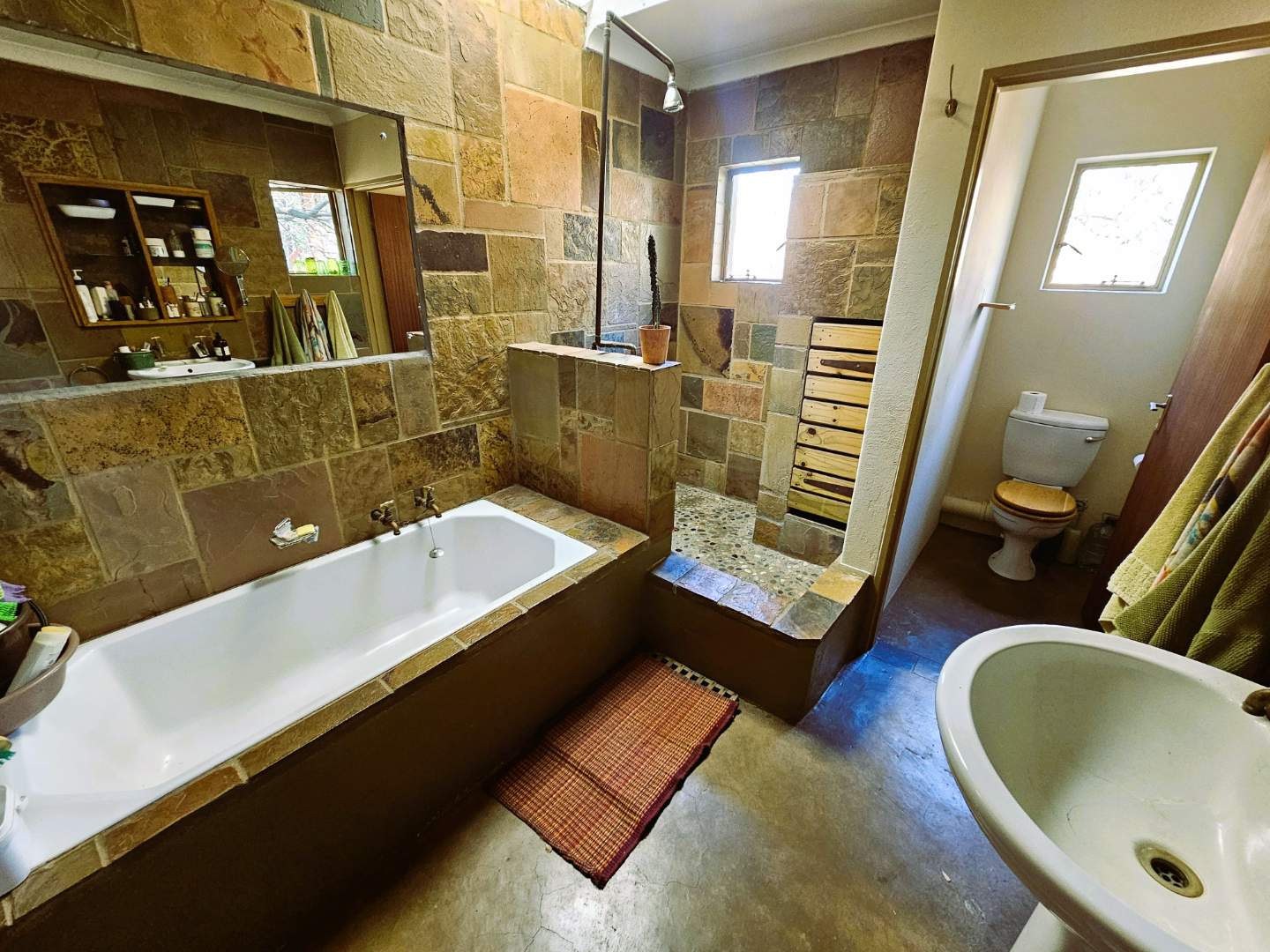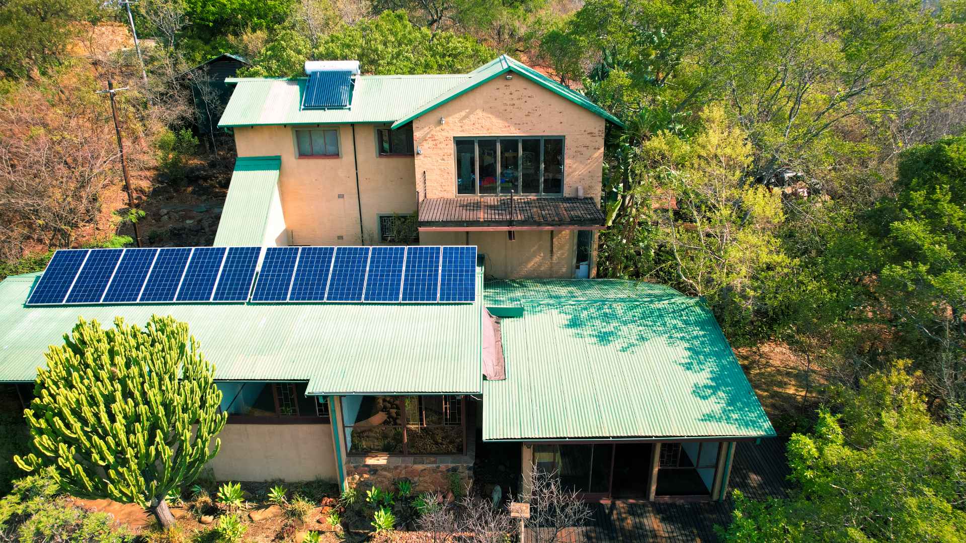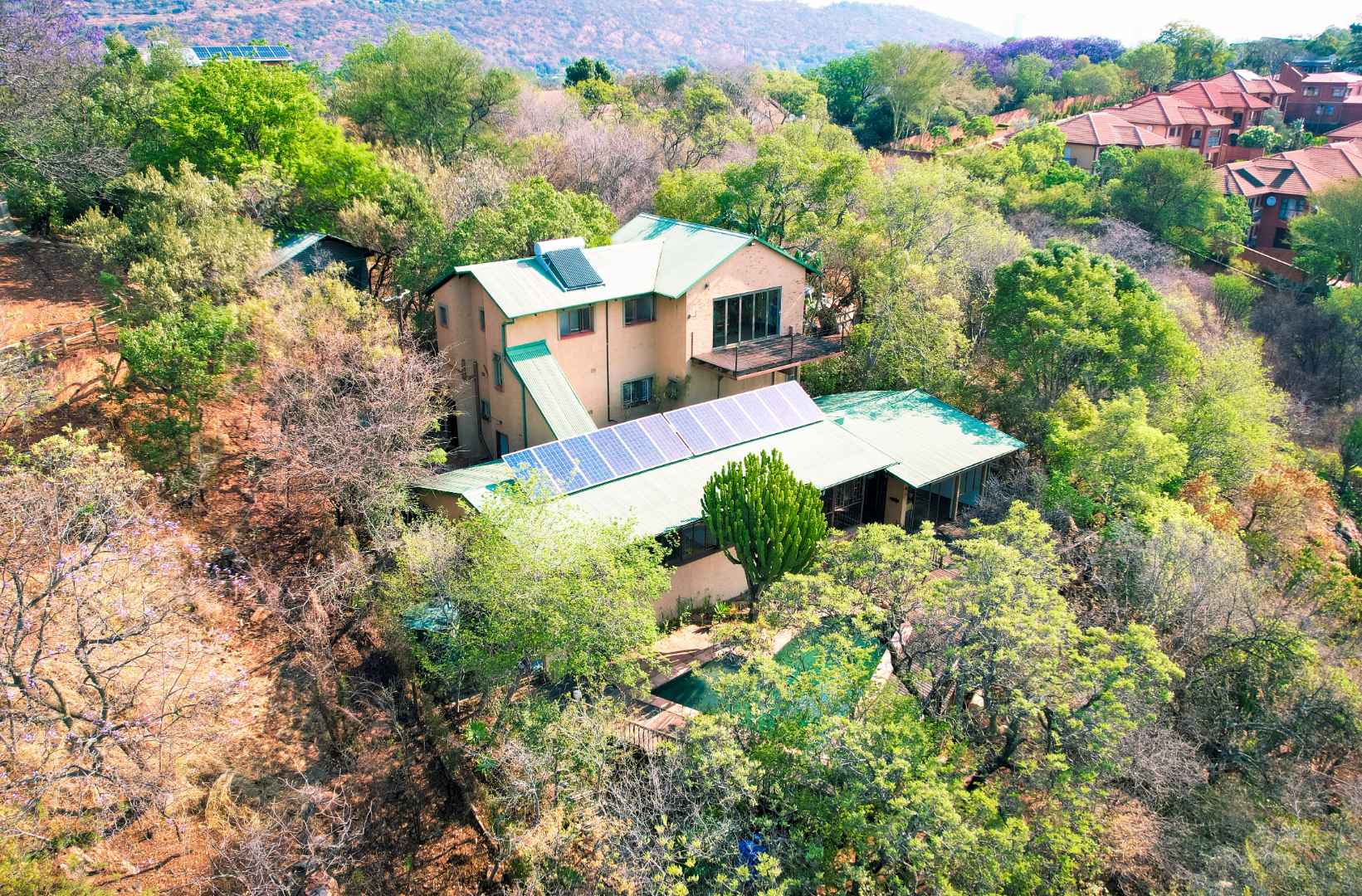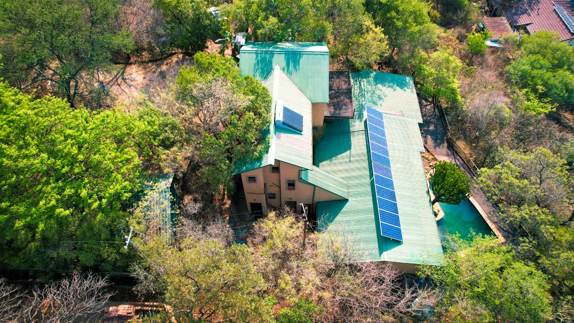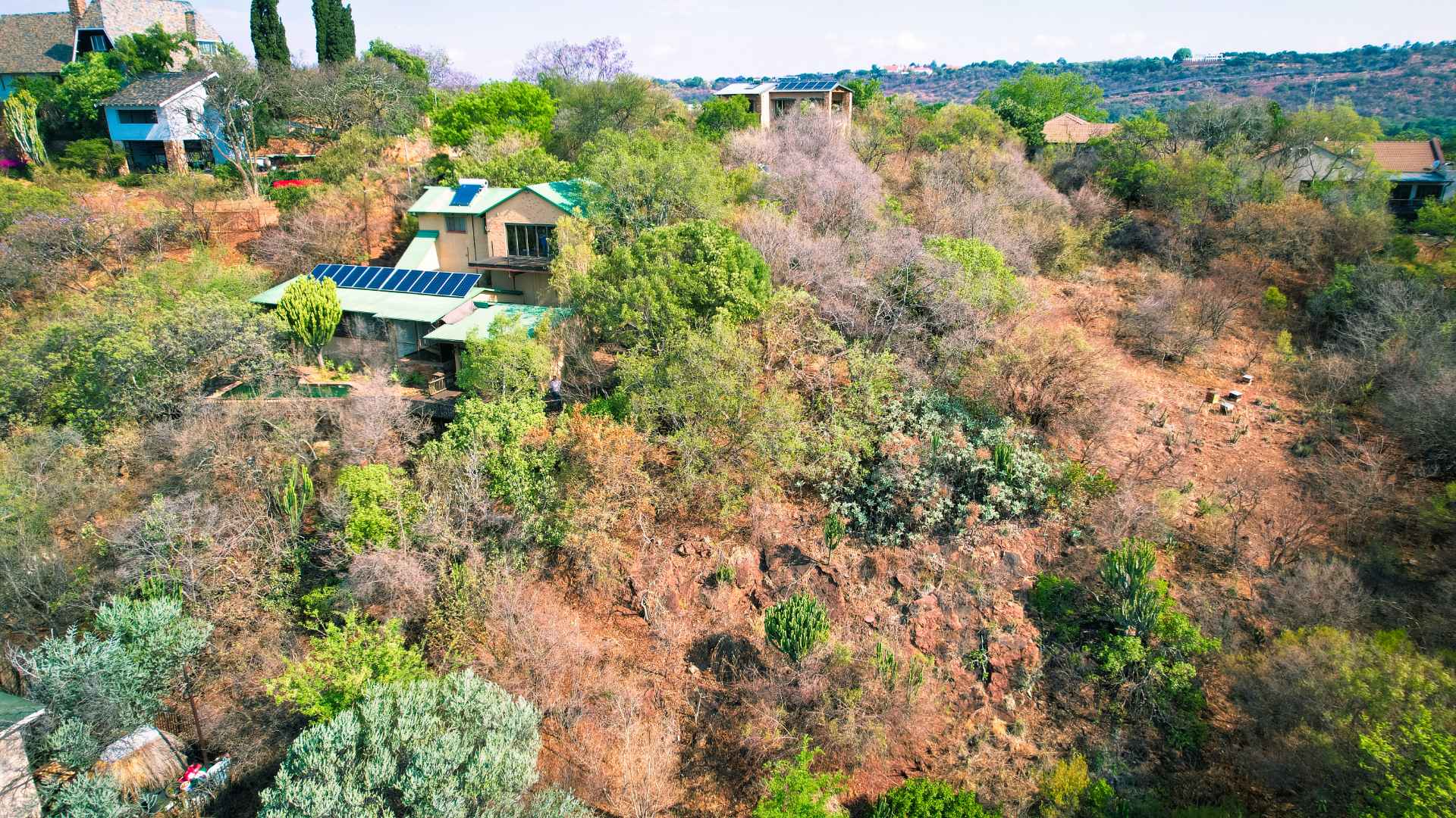 The property is equipped with solar panels, a battery system, and a water tank, ensuring no loadshedding interruptions. It also includes a bachelor flat and 3 cozy log homes, perfect for additional rental income or guests.