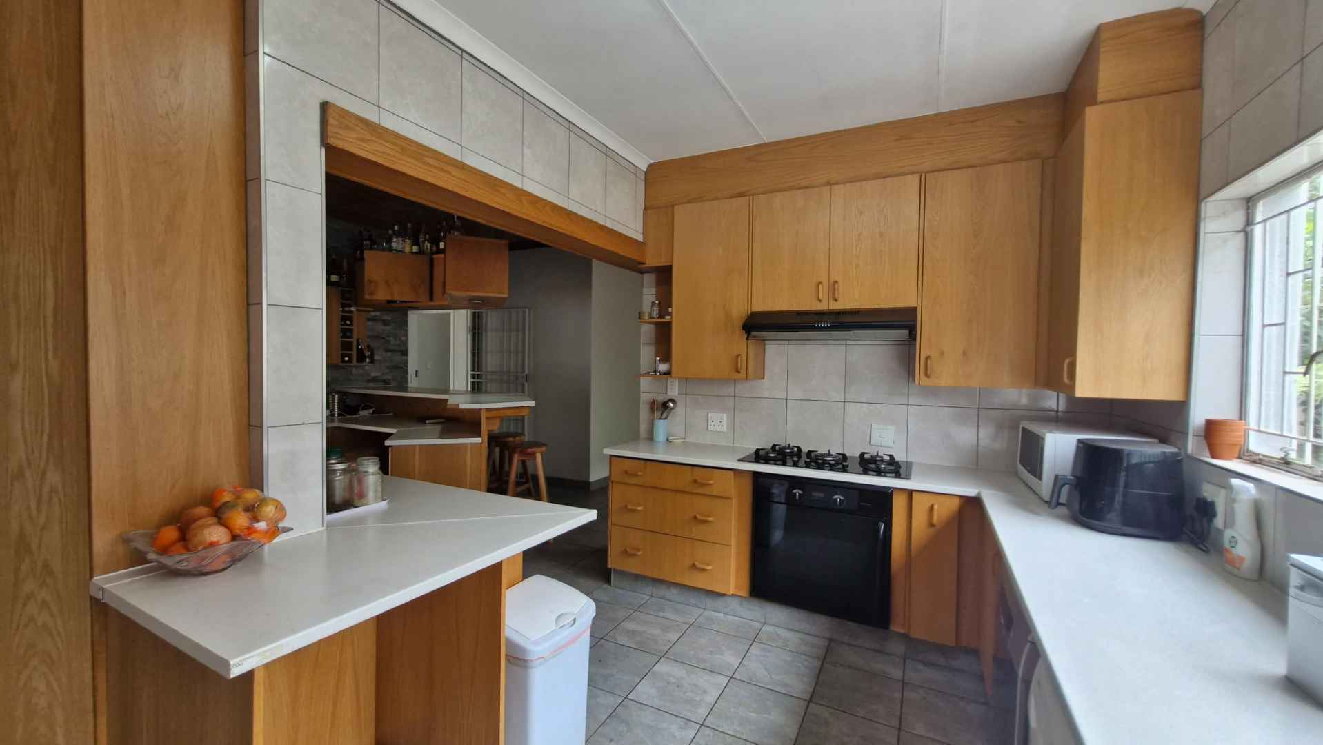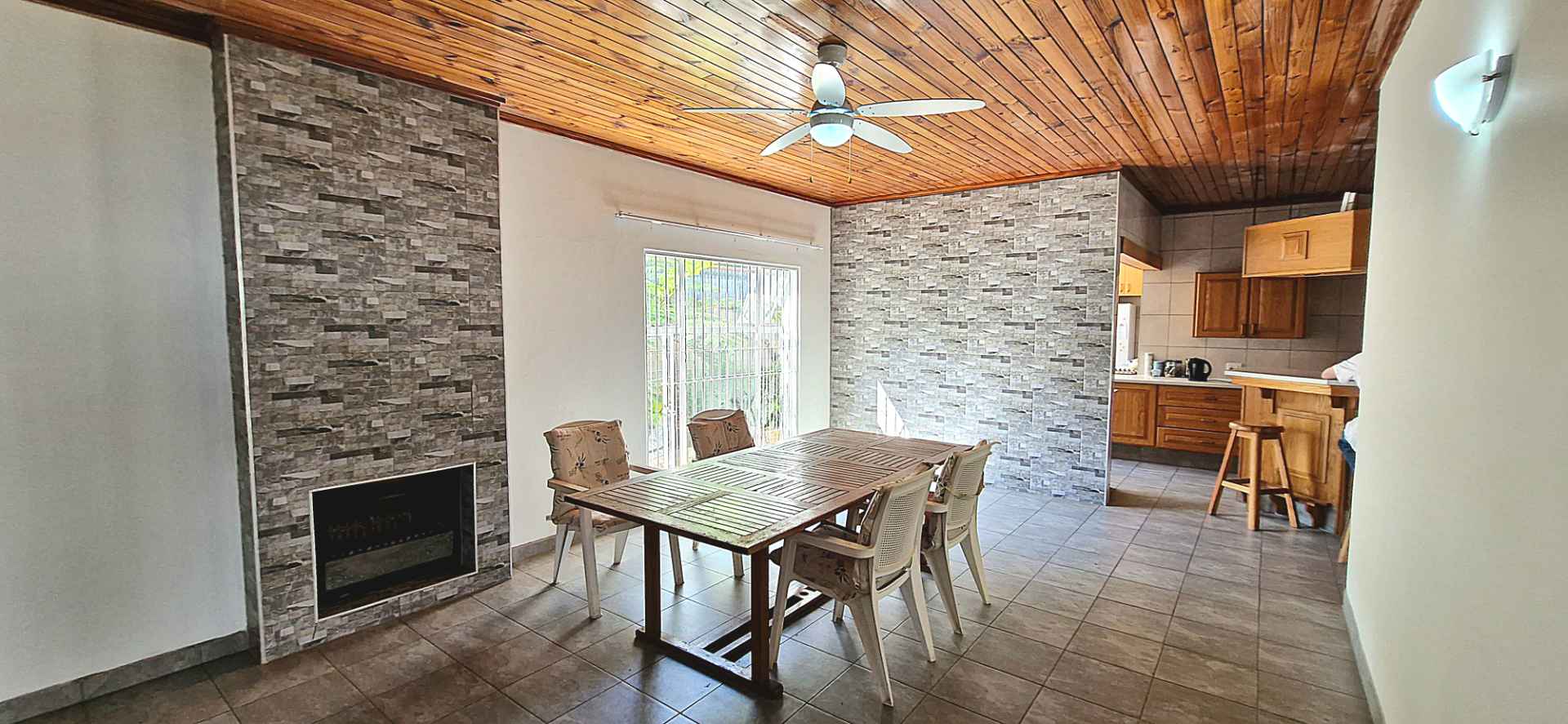 The lounge and dining areas inter-lead from the well-designed kitchen with scullery. A fireplace creates a cozy atmosphere in the dining room.