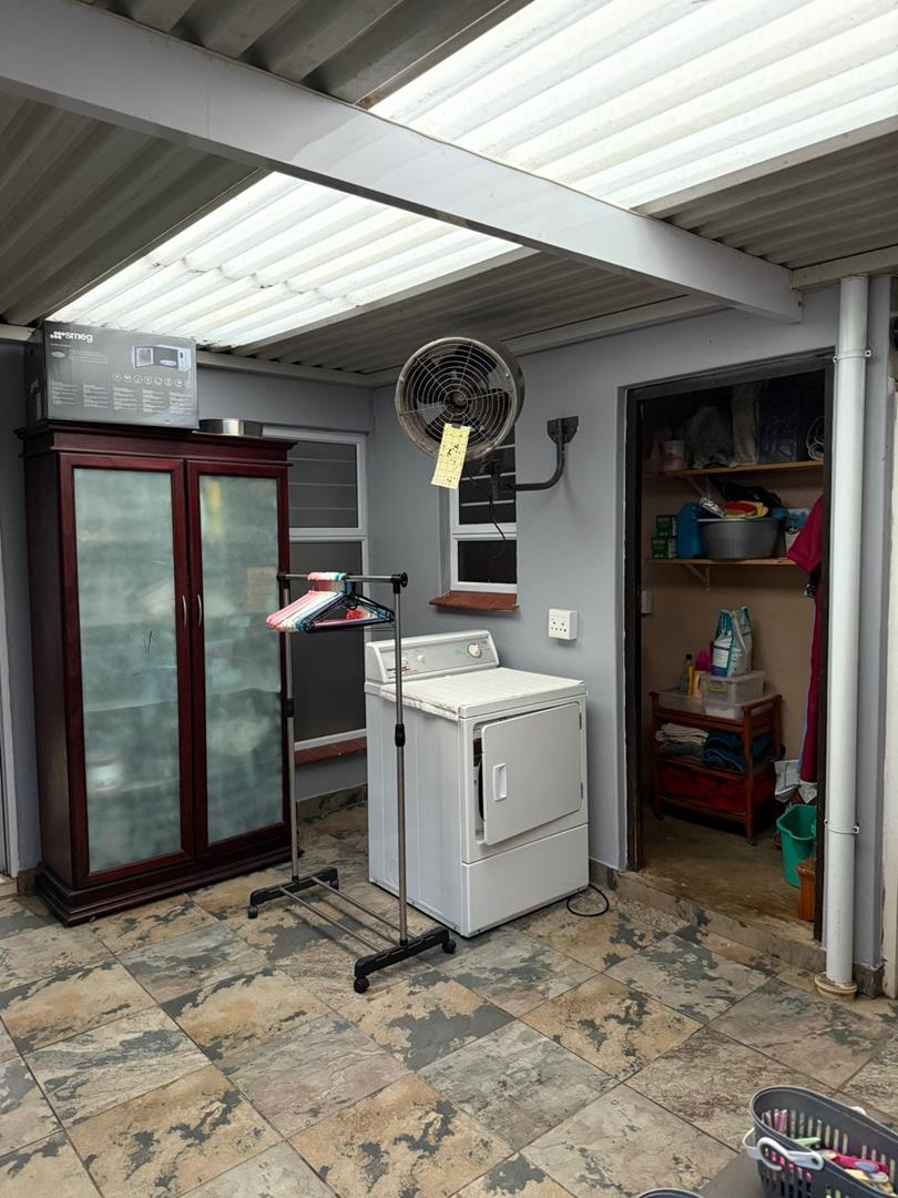 Leading off the kitchen is a large covered area with washing machine, tumble dryer and washing line. Going out the back is a covered patio ideal to enjoy a braai.
