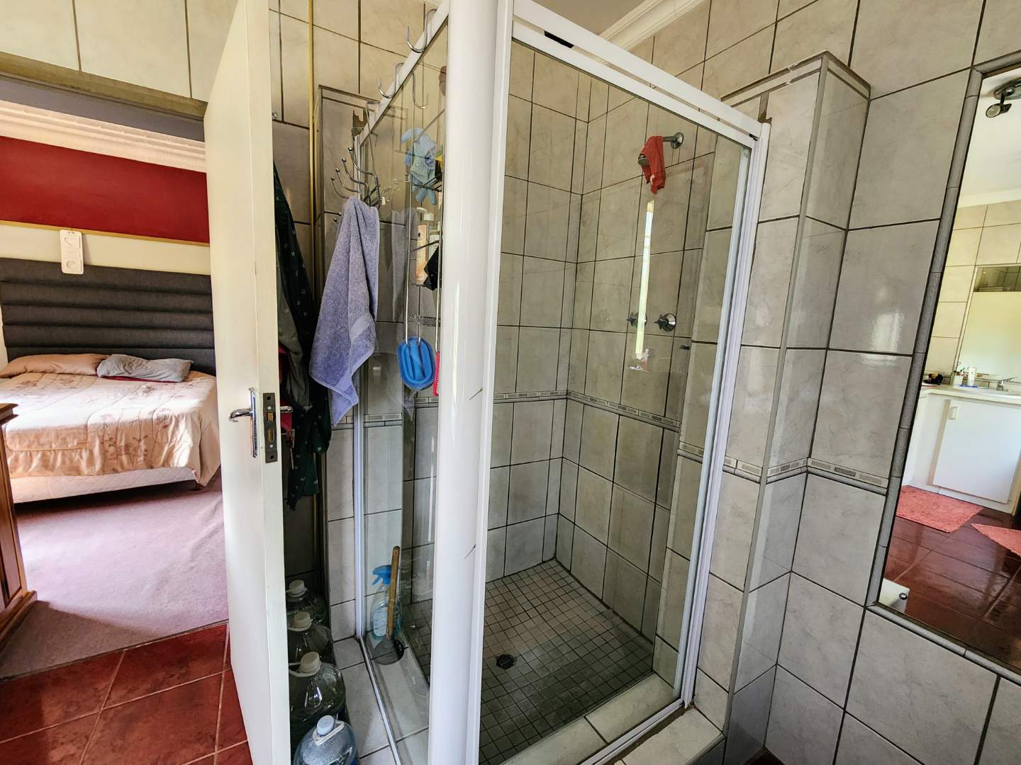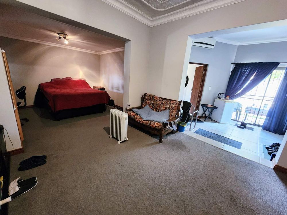 The main house features three spacious bedrooms, all with built-in cupboards. The three bathrooms include a master en-suite with a luxurious corner bath and shower, and a second bathroom with a bath, the modern third bathroom with bath and shower. The home’s living spaces are designed for comfort and flow, with a large kitchen, a separate dining room, and a spacious lounge that includes air conditioning. With five air conditioners throughout the house, comfort is guaranteed year-round. An additional study area offers a quiet retreat for work or hobbies. A beautiful secret lies beneath the carpets: original parquet flooring, just waiting to be restored.