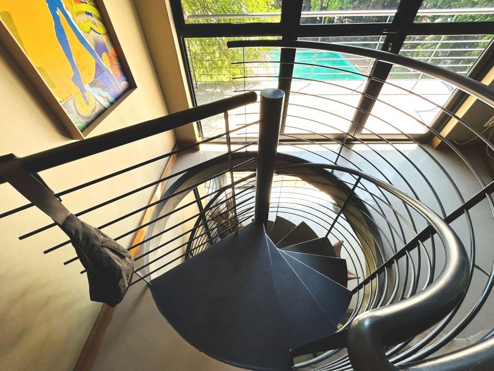 Downstairs: The Open-Plan Living, Dining, and Kitchen Area features folding doors that open directly onto the garden and the extra-large pool. Wooden doors lead into a flexible space ideal for an Art Studio, Office, or extra Bedroom. A striking spiral staircase serves as a beautiful focal point, leading to the upper level.