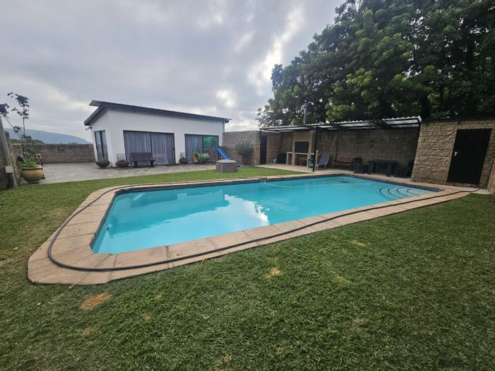 Serene Moot Valley retreat near Steve Biko Hospital with expansive pool deck and entertainment areas, plus separate outdoor office and cabin — three bedrooms, 2.5 baths, parking for five.