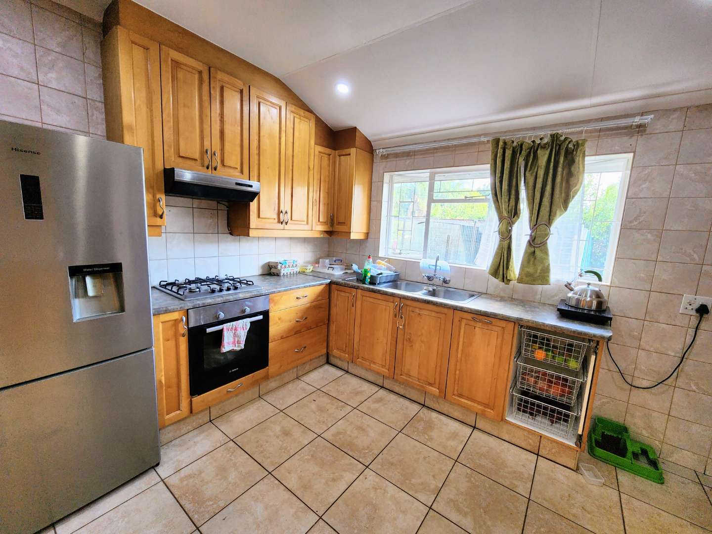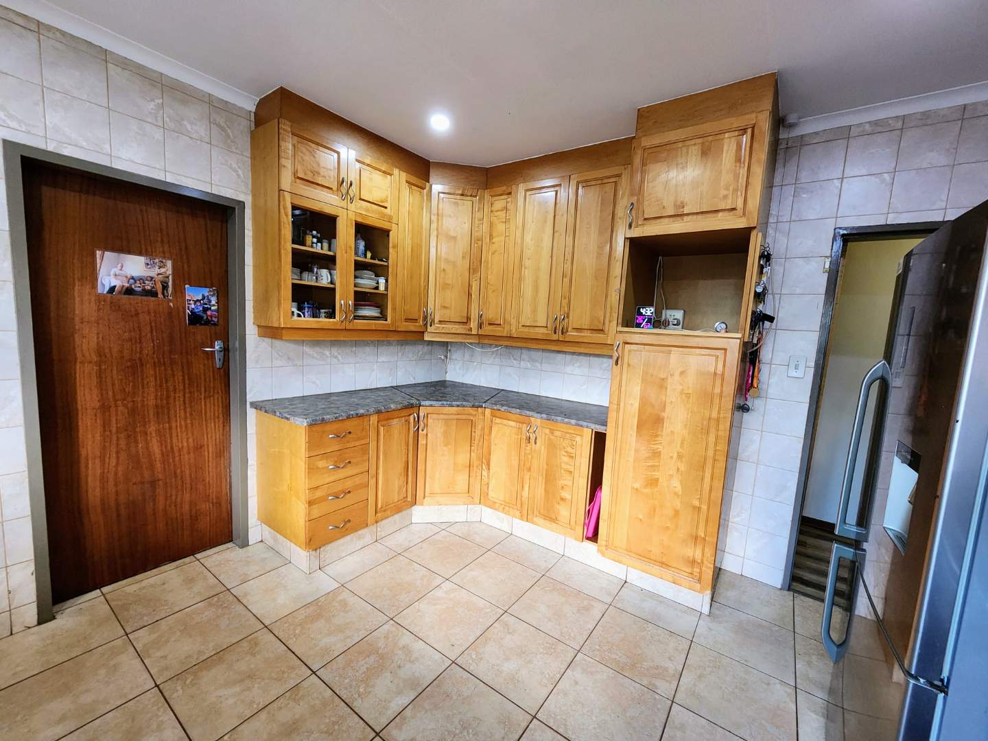 The heart of the home features a massive open-plan lounge and dining area, fitted with a large air conditioner to ensure year-round comfort for the whole family. For the home chef, the extra-large kitchen is a standout, boasting an abundance of cabinetry, a gas stove, an electrical oven, and a double basin. A dedicated laundry room provides ample space for both a washing machine and a tumble dryer, keeping the main living areas clutter-free.